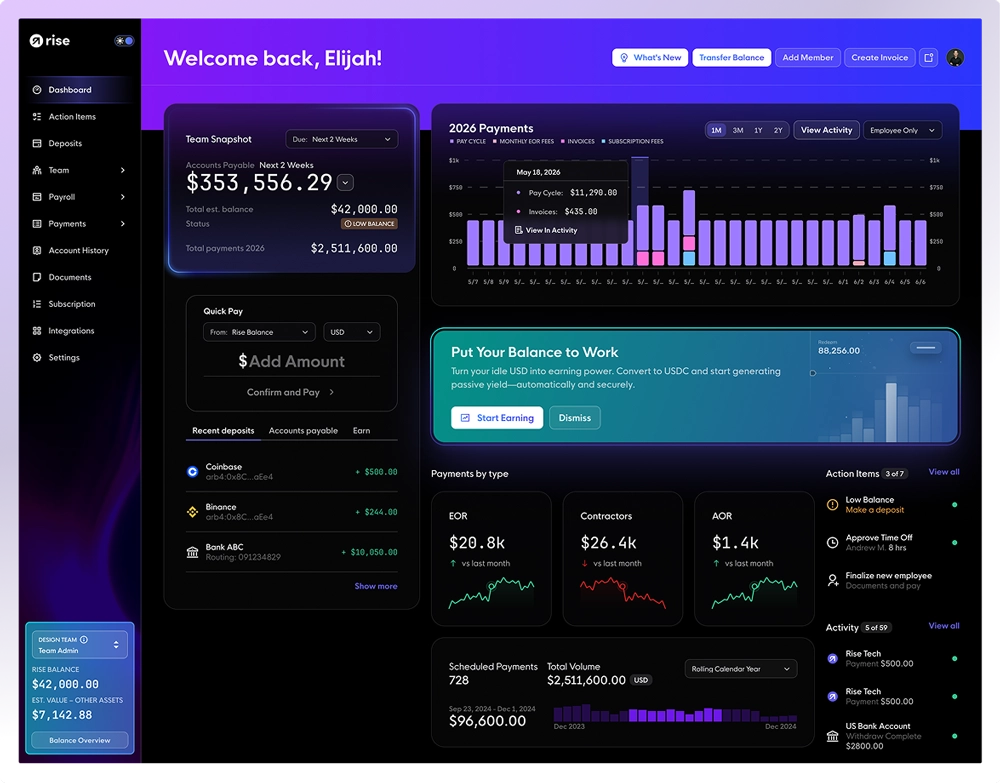 Navigating international regulations is no longer a headache. Rise ensures your compliance, from worker identity verification to KYC/AML, so you can focus on growth, not red tape.